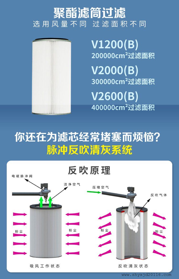 工作原理是含尘气体由风机通过吸尘管吸入箱体,进入滤袋过滤,粉尘颗粒被滤袋阻留在表面,经过过滤的净化气体由出风口排出,采用立式垂直组合结构,推拉抽屉式储尘、滤筒除式尘、脉冲喷吹清灰、抽风口等构成,可直接排放在室内循环使用,也可根据需要排出室外。稳定并可连续24小时工作;机器具有漏电,缺相、过热及过载保护装置,整个除尘过滤是一个重力,惯性力,碰撞,静电吸附,筛滤等综合效应的结果。汽车轮船制造:用于内部焊渣、粉尘、污物的清除及喷漆前的打磨除尘作业,除尘器连续工作一段时间后,滤袋表面的粉尘不断增加,继而进行清灰,粉尘抖落在集尘器(抽屉)中,再由人工进行处。配置聚酯纤维防油防水材质,对当量直径在3微米以上粉尘过滤精度达99%以上,可选更高过滤精度滤筒材质,